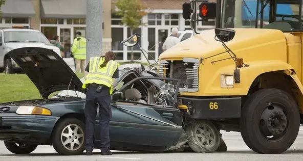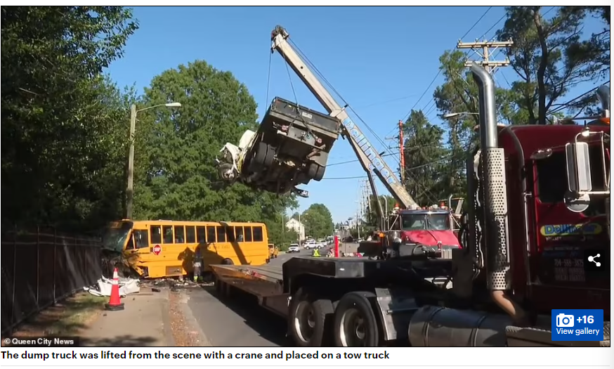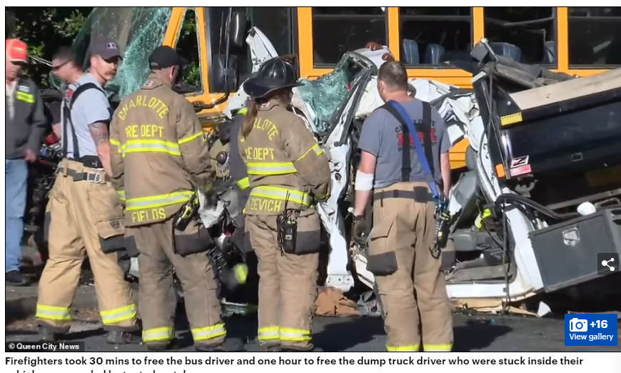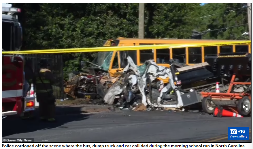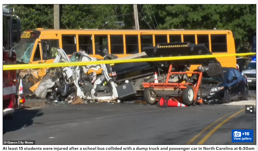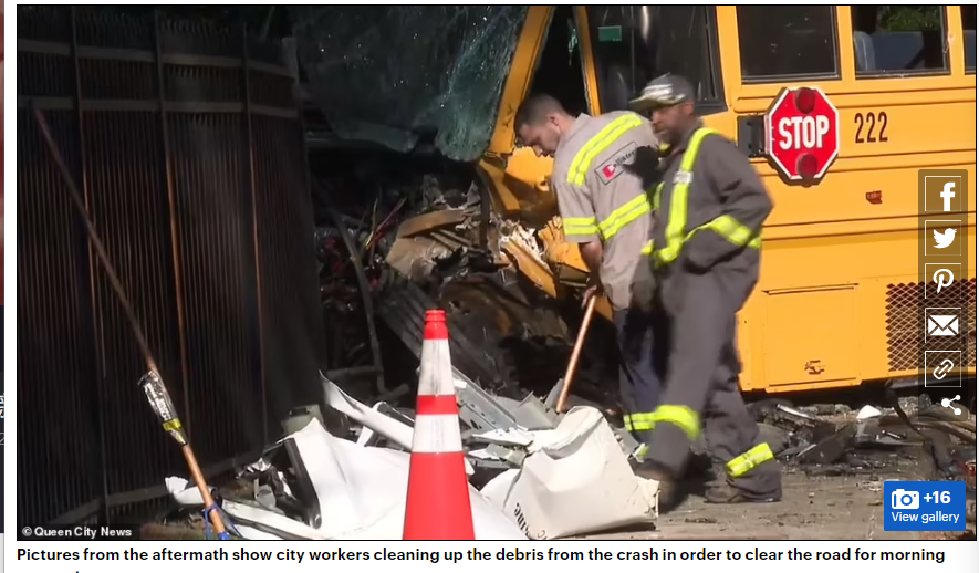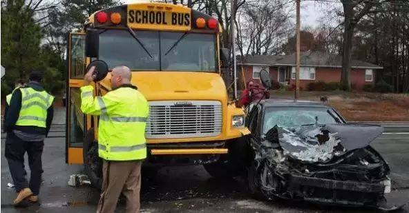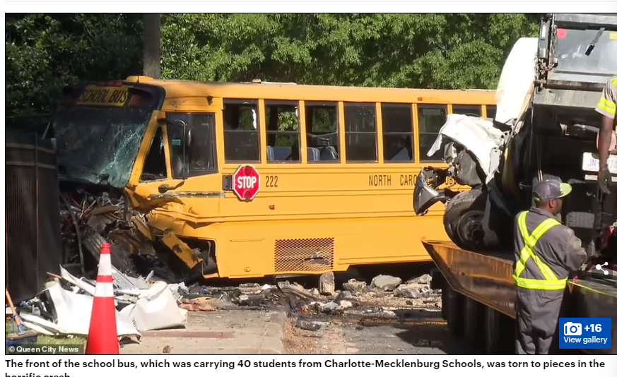 一辆承载了40名学生的校车,开往南梅克伦堡高中(South Mecklenburg High School),结果在经过一个T字形路口时,被一辆卡车猛烈的撞中了腰部!