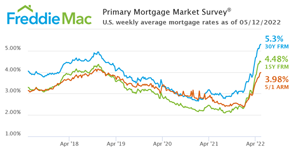 30年固定利率抵押贷款再度上升,房地美公布5月12日一周以来的平均利率到达5.30%,较前一周上扬了0.03%。这是我们十多年来从未见过的高度。