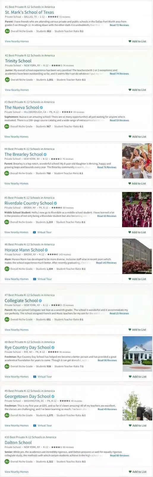 在美国著名的学校排名网站Niche上,你会惊奇的发现,全美国前十的PreK-12的学校里纽约占了7所。