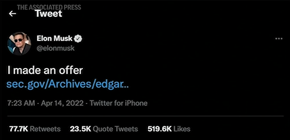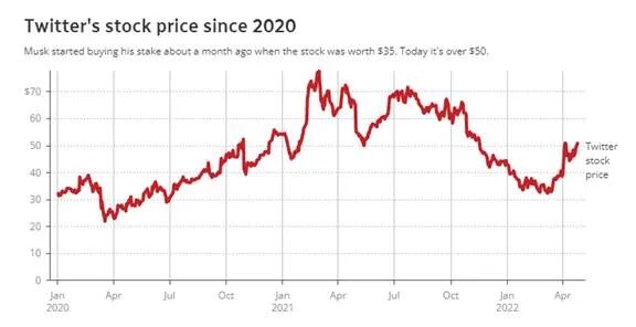 4月25日,推特董事会投票,同意将公司以440亿美元价格,出售给科技大亨马斯克。这个价格,比4月1日,推特的收盘价还要高出38%。