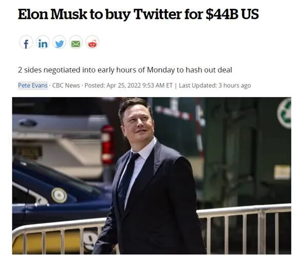 整个4月份,就已经传出“马斯克成为推特最大股东”、“马斯克借钱买推特”等消息,直至刚刚收购的消息被证实。