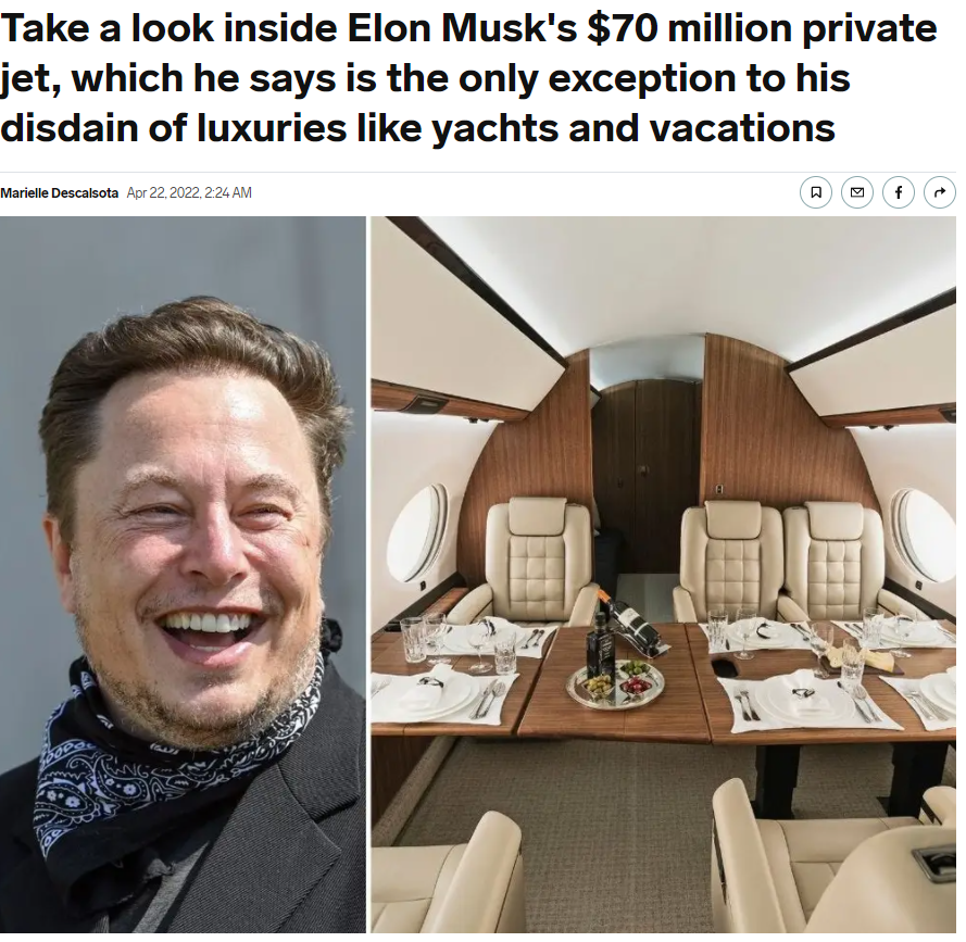 这么一听,对比花里胡哨的有钱人们,马斯克算是挺节俭的了,但众人不知道的是,马斯克唯一的奢侈品开销,就是他的私人飞机。