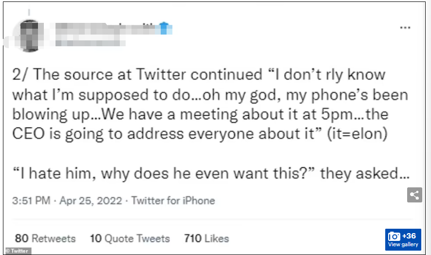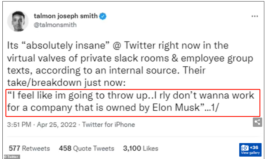 据美媒《纽约时报》报道,被收购的消息一出来,推特内部群就一片哗然,很多人害怕丢工作,但更多人是讨厌马斯克!