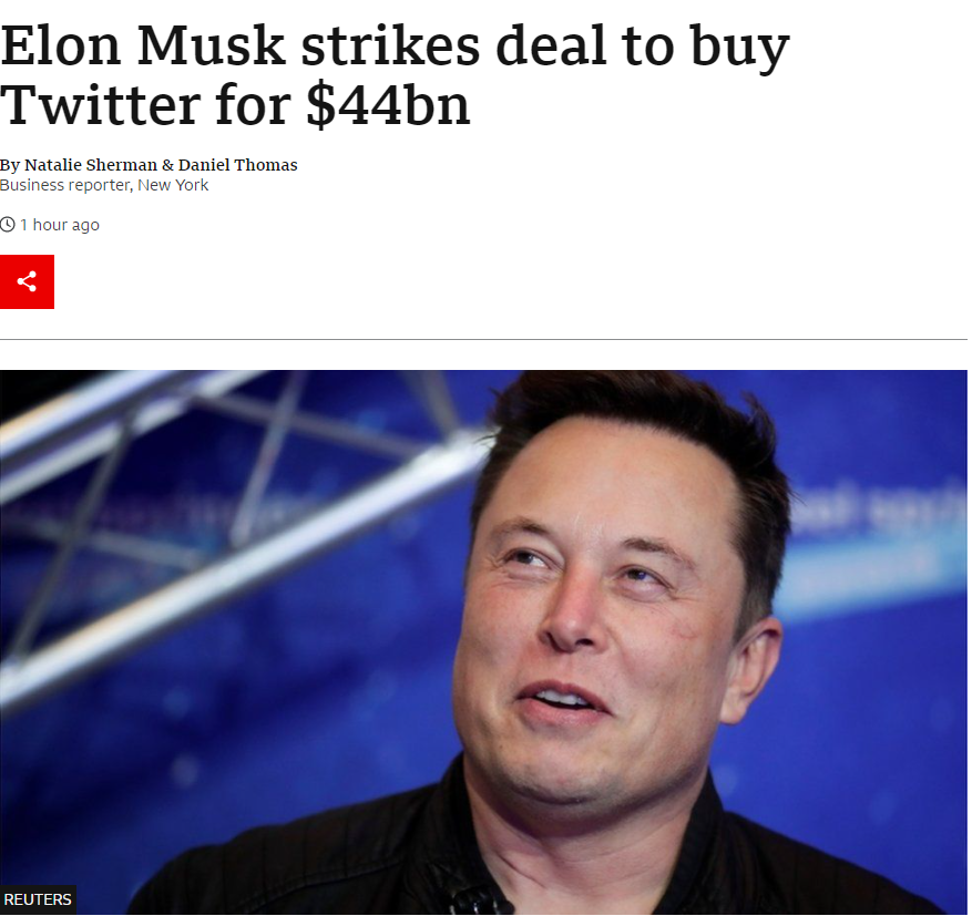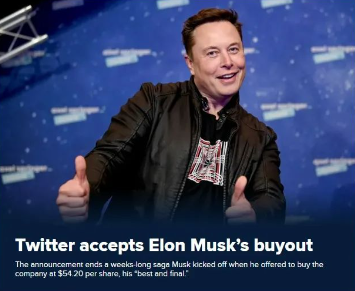 社群媒体巨头——推特(Twitter Inc.)官宣,董事会已与马斯克(Elon Musk)完成了每股54.20美元,总价值近440亿美元的交易!