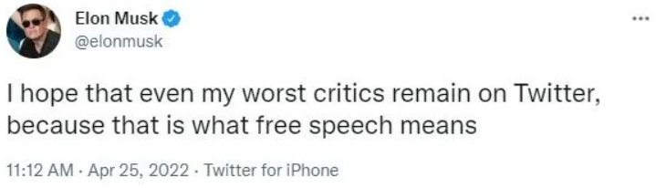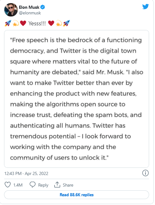 “言论自由是民主政治正常运作的基石,推特是一座数字言论广场,对人类前途攸关重大的事情可在这里讨论。推特有庞大的潜力,并期待释放出它的非凡潜力”!